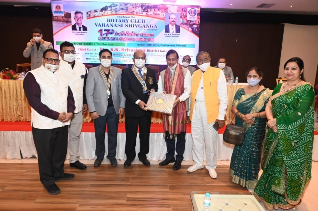 वाराणसी । रोटरी क्लब वाराणसी शिवगंगा का 17वाँ पदग्रहण व स्थापना दिवस समारोह आज रविवार, 4 अक्टूबर 2020 को पूर्वाह्न कैण्टूमेंट स्थित होटल सूर्या में कोविड-19 के निर्देशों का पालन करते हुए सम्पन्न हुआ। जिसमें नवनिर्वाचित अध्यक्ष आनन्द बर्मन को निर्वतमान अध्यक्ष विष्णु जैन ने तथा नवनिर्वाचित सचिव अनूप नागर को निवर्तमान सचिव गिरीश चन्द्र ने पदभार सौंपा। इस अवसर पर मण्डलाध्यक्ष रो. के. के. श्रीवास्तव का क्लब में आधिकारिक आगमन पर अभिनन्दन भी किया गया। उन्होंने अपने एकदिनी प्रवास के दौरान क्लब के गतिविधियों की जानकारी ली।
