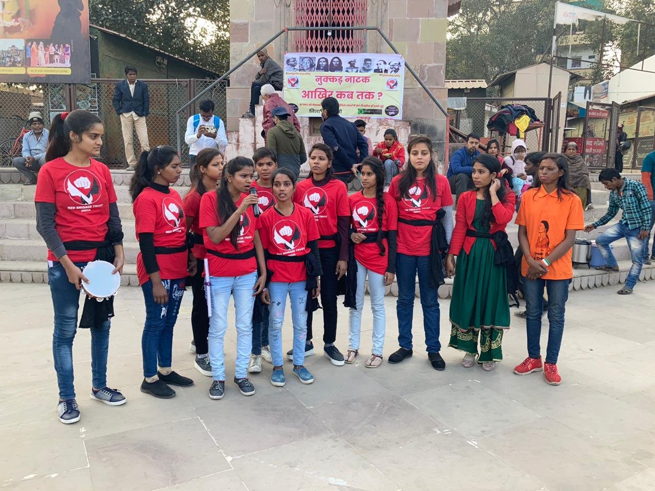 नुक्कड़ नाटक के जरिए महिलाओं से संबंधित विभिन्न सामाजिक समस्याओें के प्रति लोगों को जागरूक किया। ट्रस्ट की लड़कियों ने महिला हिंसा, भेदभाव, ग़ैर बराबरी, अम्ल आक्रमण (एसिड अटैक), खुले में तेज़ाब बिक्री आदि जैसी समस्याओं को नुक्कड़ नाटक के माध्यम से प्रस्तुत किया। नाटक देखने के लिए बड़ी संख्या में देशी-विदेशी पर्यटकों के साथ क्षेत्रीय लोग मौजूद रहे। सभी ने महिलाओं पर हो रहे अत्याचारों के प्रति प्रस्तुत किए गए बेहतरीन नाटक की प्रशंसा की। रेड ब्रिगेड ट्रस्ट के प्रमुख अजय पटेल ने उत्साह वर्धन किया नाटक की रूपरेखा रतन यादव ने तैयार की। संचालन राजकुमार गुप्ता ने किया। नाटक आख़िर कब तक में दिखाया गया कि एक एसिड अटैक पीड़िता को समाज किस तरह से उपेक्षित और ग़ैर बराबरी करता है। समाज इस तरह से अपनी बात रखता है कि नारी को लगे कि अब आत्महत्या ही उसे लिए अंतिम विकल्प है। एसिड बनाने वाले तत्व हाइड्रोजन, सल्फर और ऑक्सीजन का किरदार भी कलाकारों ने निभाया। ये तत्व आपस में बातें करते हैं कि हम तो दवाएं बनाने के काम आते थे लेकिन ये क्या इंसानों ने खुद के विनाश का माध्यम ही हमें ही बना लिया। कुछ भी हो पीड़िता हिम्मत नहीं हारती और कहती है कि मैं क्यों मरूं। मैं जीऊंगी…। नारी तो हिम्मत, हौसले की मिसाल है इसलिए मैं नहीं मरूंगी।