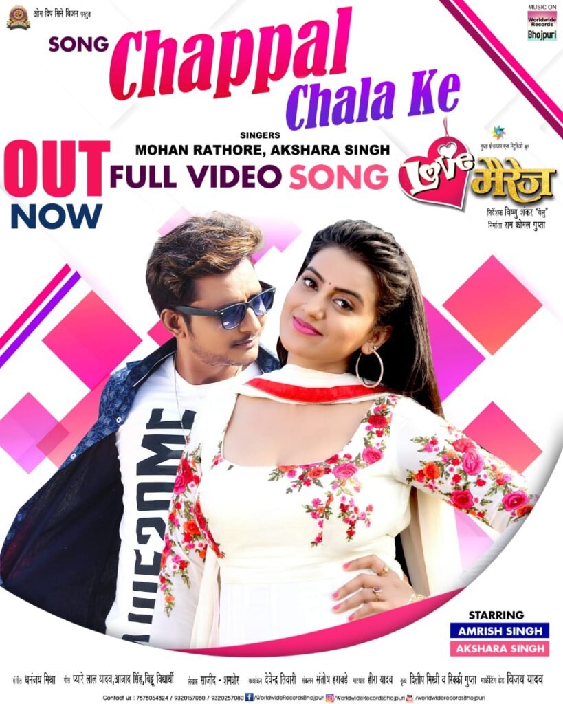 भोजपुरी की पॉपुलर ऎक्ट्रेस अक्षरा सिंह और ऎक्टर अमरीश सिंह के लाजवाब अभिनय से सजी भोजपुरी फिल्म लव मैरिज का शानदार गाना “चप्पल चला के” म्यूजिक कंपनी वर्ल्डवाइड रिकॉर्ड्स भोजपुरी के ऑफिसियल यूटयूब चैनल पर आउट किया गया है। जिसे कुछ ही घन्टे में गाने को लाखों की तादाद में व्यूज मिल गए हैं। यह रिलीज होते ही वायरल हो गया है। इस वीडियो सांग में अक्षरा सिंह गाते हुए अमरीश सिंह से कहती हैं “पीछे पीछे आइबा घुरिया के, त मार देहब चप्पल चला के।” असल में गाने में अमरीश सिंह अक्षरा का पीछा करते हैं, इसी बात पर उन्हें गुस्सा आ जाता है और वह चप्पल से मारने की बात कहती हैं।