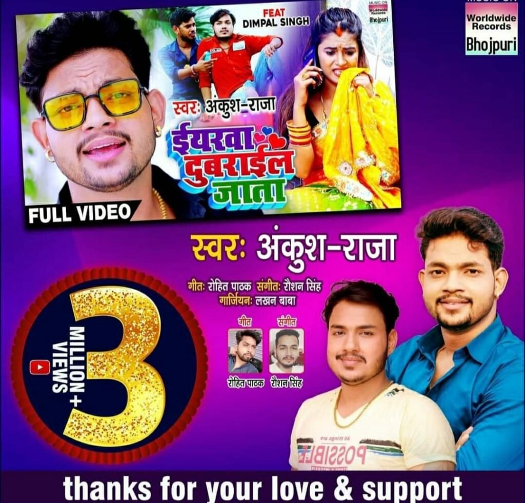 फेमस सिंगर व अभिनेता अंकुश राजा का मस्ती भरा ऑडियो सांग ईयरवा दुबराईल जाता की अपार सफलता के बाद अब इस गाने का वीडियो को भी बहुत पसंद किया जा रहा है। अब तक इस गाने के वीडियो ने यूट्यूब पर 3 मिलियन व्यूज पार किया है। यह गाना काफी धमाल मचा रहा है। वर्ल्डवाइड रिकॉर्ड्स भोजपुरी म्यूजिक कंपनी के ऑफिसियल यूट्यूब चैनल से रिलीज किया गया इस गाने को लाखों की तादाद में व्यूज मिले हैं। यह गाना यूट्यूब पर काफी धूम मचा रहा है।