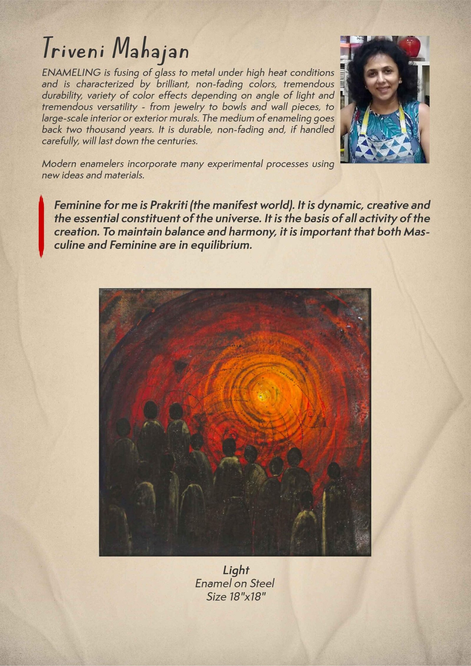 This Art Meet is held once in two months on a social media platform,where it has been widely accepted. ART GROOVES recently exhibited art pieces of extremely talented artists from 26 -28th February, 2021 indeed a successful show. ART GROOVES just released its special e catalog on Woman’s day The women exhibiting their works in this e-catalog come from various spheres of life and that is well spoken through these works. Enameling on steel by Triveni Mahajan is a unique form of art. She believes in the equality of the masculine and the feminine.