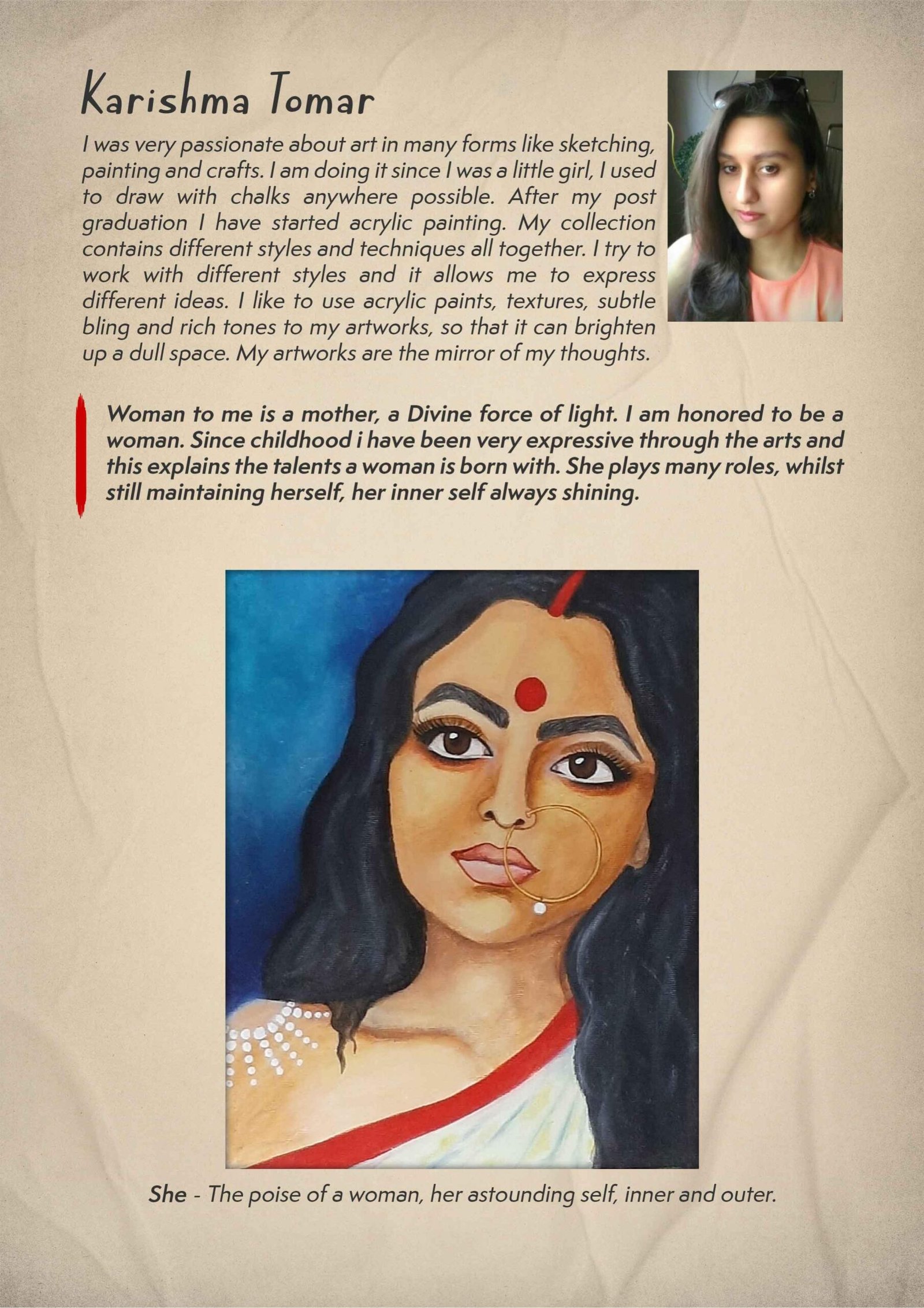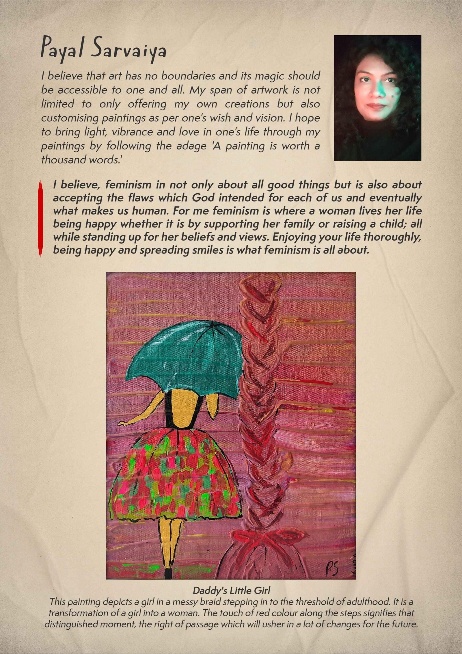 Payal Sarvaiya brings out her representation through ‘Meera’. ‘Women acting upon their beliefs’, holds immense value for her. Vasudha Arora, has lent her sketches a defining look. For her motherhood is womanhood. Saluting the Divine in every woman, is founder Poornima Dayal, whose depiction of The Feminine Divine self through art is incredible. Vedha Sreeram, an art teacher brings her pen to art, drawing Mandalas, presenting her version of Prakriti. The Mother and daughter painted by Sharmila Lonkar is next to real. Young artists add more color through their imagination completing this catalog in a befitting way. Other amazing artists include Ambika Kapoor Vij, Rhea Shah, Soha Dalwai to name a few. Click here to view e-catalog https://bit.ly/3c68p04