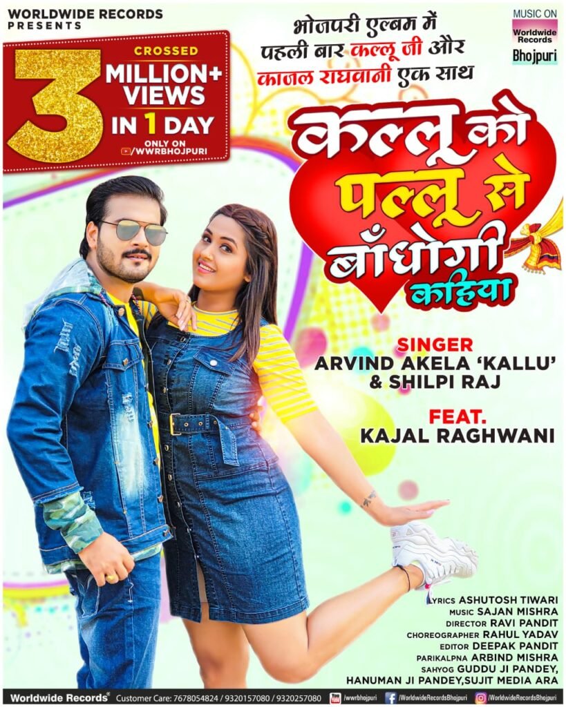 मुंबई : वर्ल्डवाइड रिकार्ड्स प्रस्तुत भोजपुरी एल्बम के इतिहास में पहली बार सुपर स्टार अरविन्द अकेला कल्लू और काजल राघवानी एक साथ रिलीज हुआ वीडियो सांग कल्लू को पल्लू से बाँधोगी कहिया ने 1 दिन में 3 मिलियन व्यूज का रिकॉर्ड बना लिया है। यह सांग वर्ल्डवाइड रिकार्ड्स भोजपुरी के ऑफिसियल चैनल से रिलीज किया गया है। इस खूबसूरत गाने को अरविन्द अकेला कल्लू और गायिका शिल्पी राज ने अपनी मधुर आवाज मे गाया है।