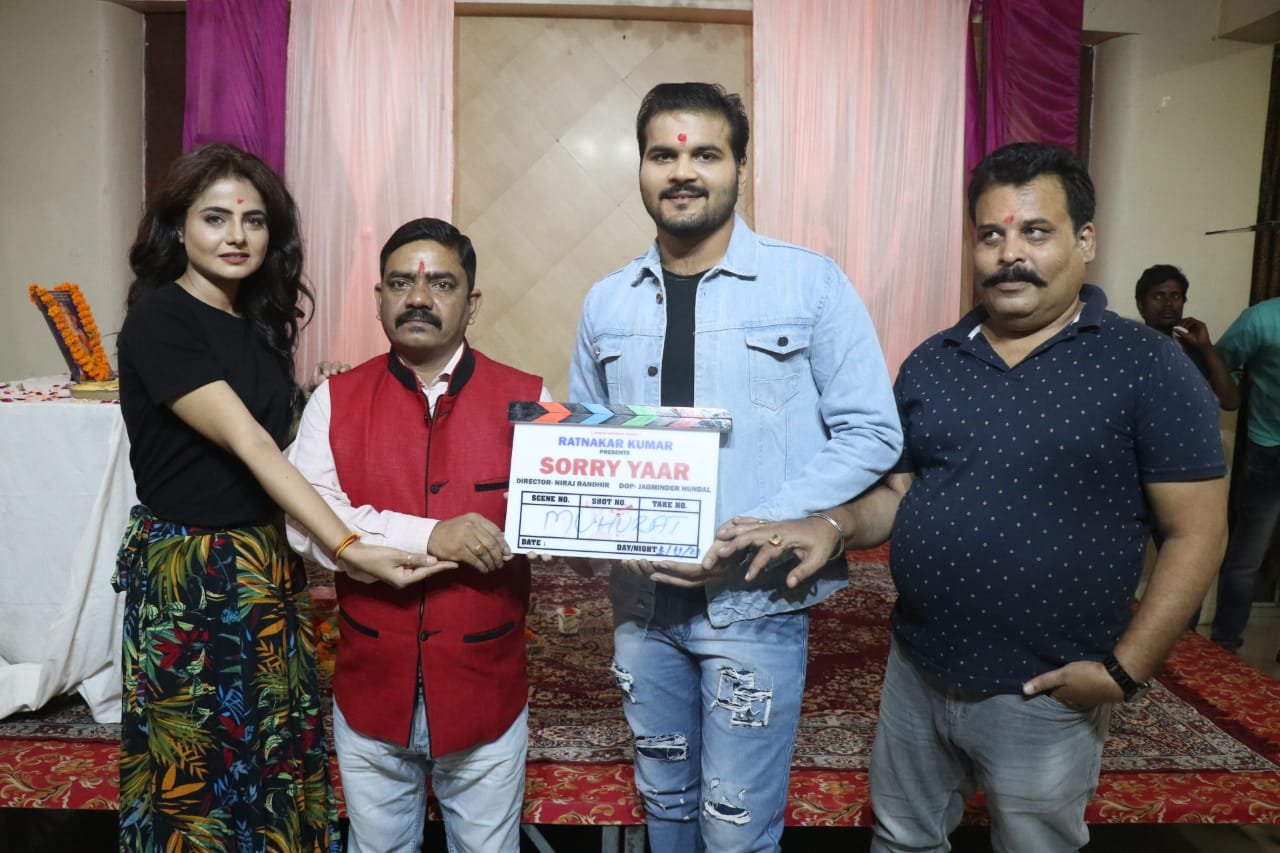 बता दें कि भोजपुरी फिल्म इंडस्ट्री में कई सुपरहिट फिल्में दे चुके डायरेक्टर नीरज रणधीर के निर्देशन में एक और बेहतरीन भोजपुरी फिल्म का निर्माण किया जा रहा है। जिसका टाइटल बड़ा ही यूनिक रखा गया है – “सॉरी यार”। अरविन्द अकेला कल्लू और प्रीति शुक्ला स्टारर फ़िल्म “सॉरी यार” का भव्य मुहूर्त विधिवत पूजा-पाठ करके किया गया। फ़िल्म के मुहूर्त की पूजा वैदिक मंत्रोच्चार के साथ पुरोहित प्रवीण शास्त्री ने कराया। फ़िल्म के मुहूर्त के शुभ अवसर पर फिल्म की पूरी यूनिट सहित कई दिग्गज हस्तियाँ मौजूद रहीं। इस शुभ मौके पर आए हुए विशिष्ट अतिथियों सहित सभी ने फिल्म के निर्माता-निर्देशक एवं पूरी टीम को बधाई व शुभकामनाएं दी। साथ ही फिल्म की सफलता की कामना की।