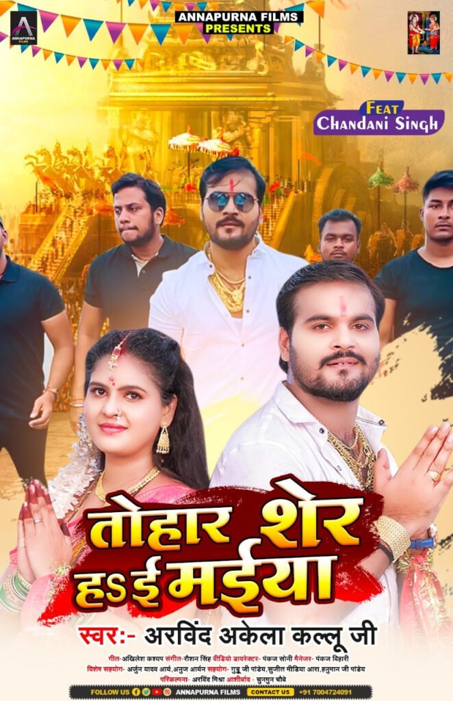 दुर्गा पूजा और नवरात्रि के उप्लक्षय में भोजपुरी के सुपर स्टार अरविन्द अकेला कल्लू अपने फैन्स के लिए एक शानदार देवी गीत “तोहार शेर हई मइया” कल सुबह लेकर आ रहे है। इस धमाल वीडियो सांग को कल 1 अक्टूबर को अन्नपुर्णा फिल्म्स के ऑफिसियल युट्युब चैनल पर रिलीज किया जाएगा। इसमे अरविन्द अकेला कल्लू के अपोज़िट फ़िल्म हीरोइन चांदनी सिंह ने काम किया है वो बेहद खूबसूरत लग रहीं हैं। अरविन्द अकेला कल्लू की आवाज में यह धमाल वीडियो सांग बेहतरीन तरीके से और काफी भव्य रूप से फ़िल्माया गया है। इस गाने में अरविन्द अकेला कल्लू और उनकी ऎक्ट्रेस चाँदनी सिंह के बीच गजब केमिस्ट्री नजर आ रही है, जो इसके पोस्टर में लोग खूब पसंद कर रहे हैं।