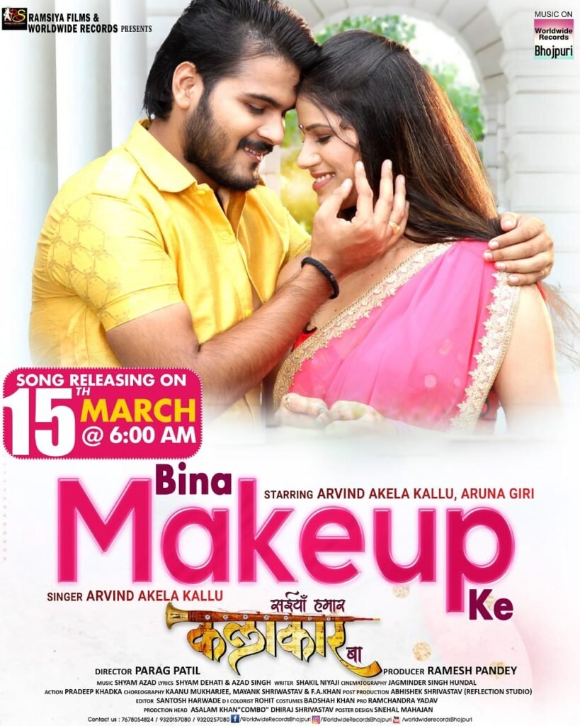 मुंबई| भोजपुरी फिल्मों के सुपरस्टार अरविन्द अकेला कल्लू की अपकमिंग भोजपुरी फिल्म “सइयां हमार कलाकार बा” का एक धमाकेदार सांग “बिना मेकअप के” म्यूजिक कंपनी वर्ल्डवाइड रिकॉर्ड्स भोजपुरी के ऑफिसियल यूट्यूब चैनल पर कल 15 मार्च की सुबह 6 बजे रिलीज़ होने वाला है। कल्लु द्वारा गाए गए इस गाने को कल्लू और सिनेतारिका अरुणा गिरी पर फिल्माया गया है।
