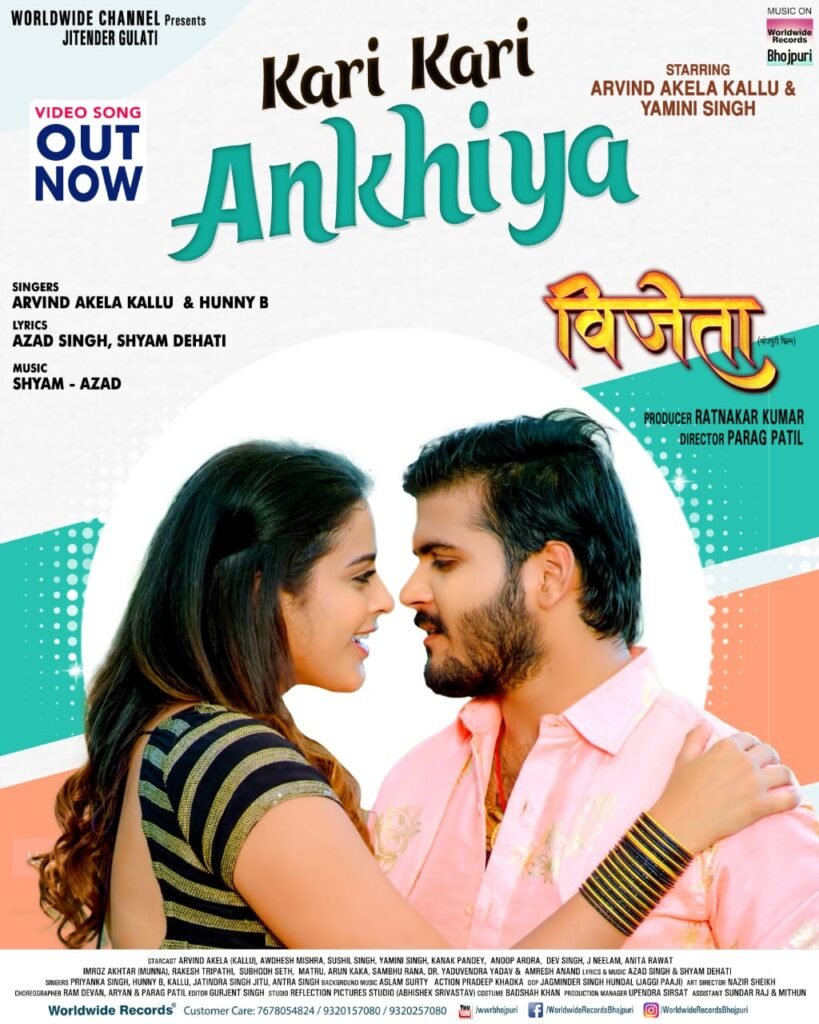 वर्ल्डवाइड चैनल एवं जीतेन्द्र गुलाटी प्रस्तुत युवा दिलों की धड़कन सुपरस्टार अरविन्द अकेला कल्लू और यामिनी सिंह के शानदार अभिनय से सजी भोजपुरी फिल्म विजेता का रोमांटिक गाना “कारी कारी अँखिया” वर्ल्डवाइड रिकार्ड्स भोजपुरी म्यूजिक कंपनी के ऑफिसियल यूट्यूब चैनल से रिलीज किया गया है। इस गाने में अरविन्द अकेला कल्लू और यामिनी सिंह रोमांटिक अंदाज नाचते गाते नजर आ रहे हैं। उनकी युगलबंदी बहुत ही मनमोहक है। गाने के फिल्मांकन में झील, फुलवारी और हरी भरी वादियां आदि बहुत ही मनोरम दृश्य दिख रहा है। इस गाने को गाया है अरविन्द अकेला कल्लू और हनी बी ने।