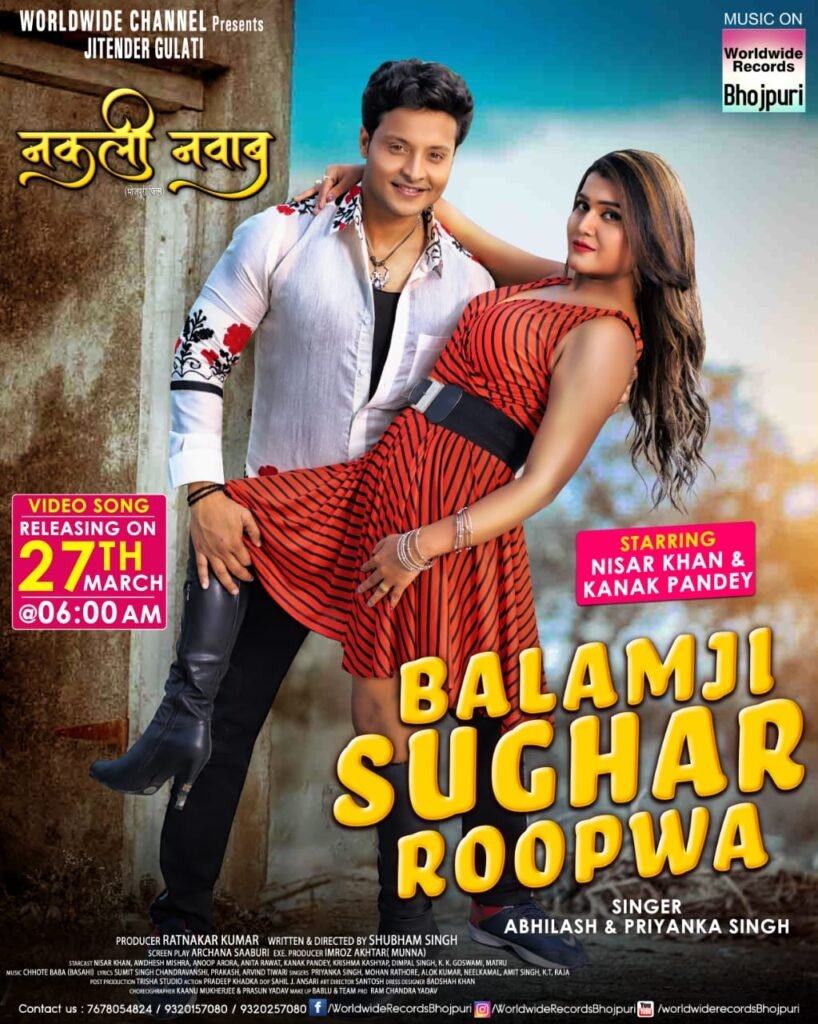 मुंबई| वर्ल्डवाइड चैनल और जितेंद्र गुलाटी प्रस्तुत निसार खान और कनक पांडेय स्टारर बहुप्रतीक्षित भोजपुरी फिल्म “नकली नवाब” का धमाकेदार वीडियो सांग “बलमजी सुघर रूपवा” कल 27 मार्च को सुबह 6 बजे वर्ल्डवाइड रिकॉर्ड्स भोजपुरी के ऑफिसियल यूट्यूब चैनल पर रिलीज होने जा रहा है। इस खास रोमांटिक गाने का टीज़र लांच कर दिया गया है जिसमें एक शानदार लोकेशन पर फिल्माए गए इस सांग में निसार खान और कनक पांडेय की जोड़ी दिख रही है। उनके बीच गजब की केमिस्ट्री और बेहतरीन डांस नजर आ रहा है। गाने का म्यूजिक कमाल का है और दोनों सितारों ने इस सांग में जान डाल दी है तो इन्तेजार बस खत्म होने जा रहा है, कल सुबह आप यह पूरा गाना वर्ल्डवाइड रिकॉर्ड्स भोजपुरी के चैनल पर देख सकेंगे।