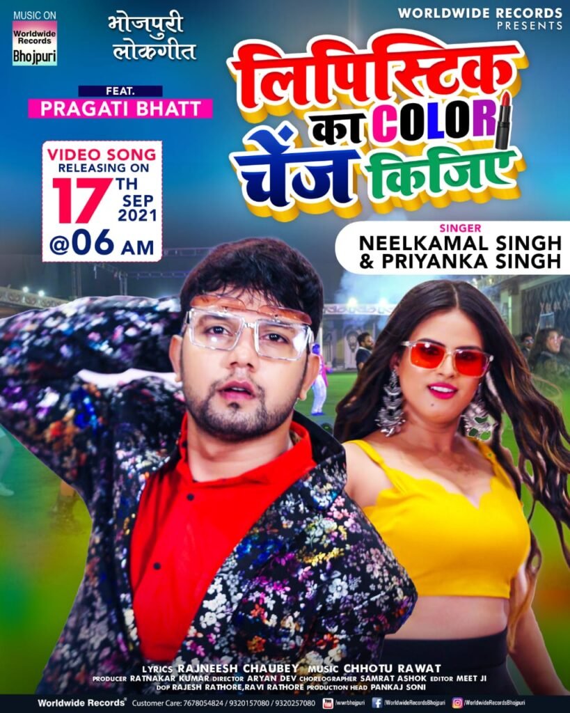 हो जाईये तैयार आ रहा है भोजपुरी इंडस्ट्री के बवाल सिंगर नीलकमल सिंह और सुपर सिंगर प्रियंका सिंह की आवाज में नया सांग ‘लिपस्टिक का Color चेंज किजिए’। ये सांग वर्ल्डवाइड रिकार्ड्स भोजपुरी के ऑफिसियल यूट्यूब चैनल पर 17 सितंबर सुबह 6 बजे रिलीज होने वाला है। ‘लिपस्टिक का Color चेंज किजिए’ में नीलकमल सिंह के साथ इंडस्ट्री की टेलेंट अभिनेत्री प्रगति भट्ट नजर आने वाली हैं।