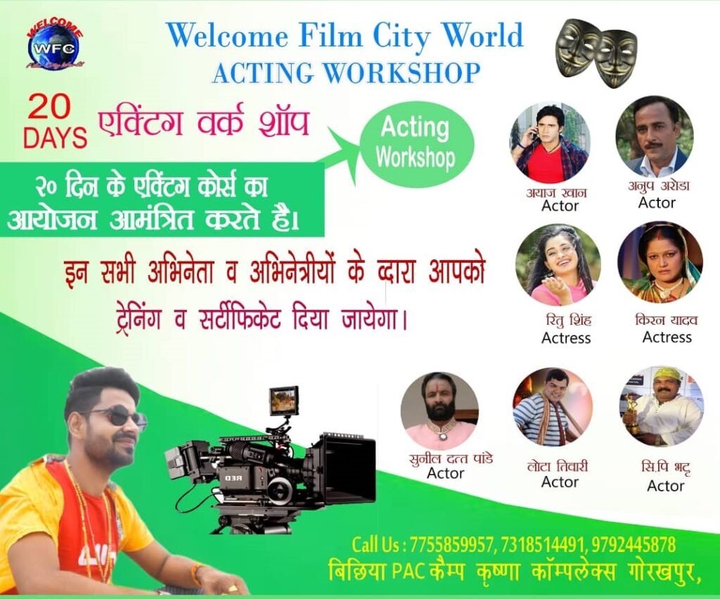 फ़िल्म इंडस्ट्री में अपनी ऐक्टिंग से खास पहचान बनाने की तमन्ना रखने वाले तमाम लोगों के लिए एक सुनहरा मौका आया है। दरअसल उत्तर प्रदेश के गोरखपुर में वेलकम फिल्मसिटी वर्ल्ड के द्वारा 20 दिनों का एक्टिंग कोर्स करवाया जा रहा है। इस एक्टिंग वर्कशॉप को अटेंड करके आप अपने अंदर अदाकारी की खूबियों को डेवलप कर सकते हैं। सबसे बड़ी बात यह है कि भोजपुरी फ़िल्म इंडस्ट्री में वर्षों से काम कर रहे कई मशहूर अभिनेता और अभिनेत्रियां आपको एक्टिंग की टिप देंगे। जिन एक्टर्स के द्वारा लोगों को ट्रेनिंग दी जाएगी उनमें अयाज़ खान, अनूप अरोड़ा, ऎक्ट्रेस ऋतु सिंह, ऎक्ट्रेस किरण यादव, सुनील दत्त पांडेय, लोटा तिवारी और सीपी भट्ट का नाम उल्लेखनीय है। यह सभी वो अभिनेता अभिनेत्री हैं जिन्होंने ढेर सारी फिल्मों में अपने अभिनय का जादू दिखाया है।