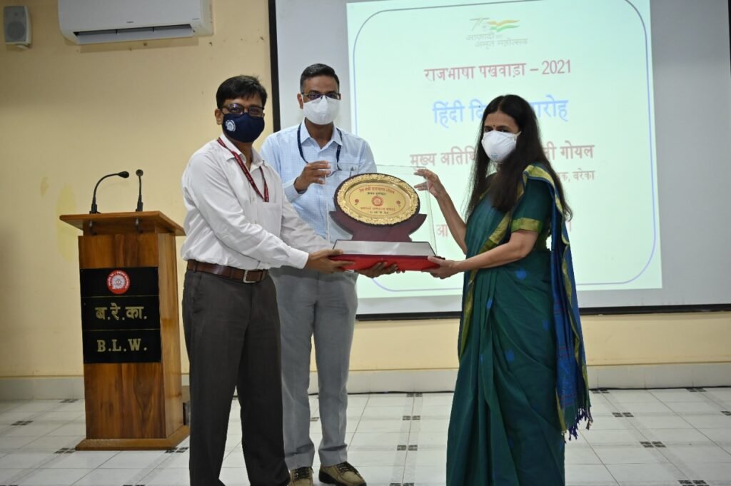 बनारस रेल इंजन कारखाना में आज दिनांक 14.09.2021 को राजभाषा पखवाड़ा 2021 का समापन हिंदी दिवस समारोह के साथ संपन्न हुआ। समारोह की अध्यक्षता करते हुए महाप्रबंधक सुश्री अंजली गोयल ने स्वतंत्रता आंदोलन में हिंदी की भूमिका की चर्चा करते हुए कहा कि हिंदी ने भारत जैसे बहुभाषी देश में संपूर्ण जनमानस को एकसूत्र में पिरोने का कार्य किया, जिससे स्वतंत्रता आंदोलन की अलख जगाने में सहायता तो मिली ही, साथ ही हिंदी की क्षमता का भी आभास हुआ। सुश्री गोयल ने अपने अध्यक्षीय संबोधन में कहा कि राष्ट्र की उन्नति के लिए तकनीक से राजभाषा को जोड़ना अत्यंत आवश्यक है। राजभाषा को हम जितना सरल बनाएंगे, उतना ही उसका विकास और प्रसार होगा। सुश्री अंजली गोयल ने अपने हिंदी दिवस संदेश में हिंदी की सेवा को आजादी आंदोलन के राष्ट्रनायकों की भावना का सम्मान भी बताया। मुख्य राजभाषा अधिकारी श्री प्रमोद कुमार चौधरी ने अपने स्वागत संबोधन में कहा कि वाराणसी नगर में स्थित केंद्रीय सरकार के कार्यालयों में भी राजभाषा के कार्यान्वयन के लिए बरेका प्रयासरत रहता है। राजभाषा पखवाड़ा के अंतर्गत आयोजित किए गए विभिन्न कार्यक्रमों की चर्चा करते हुए श्री चौधरी ने इन्हे अत्यंत उपयोगी और प्रेरणादायक बताया।