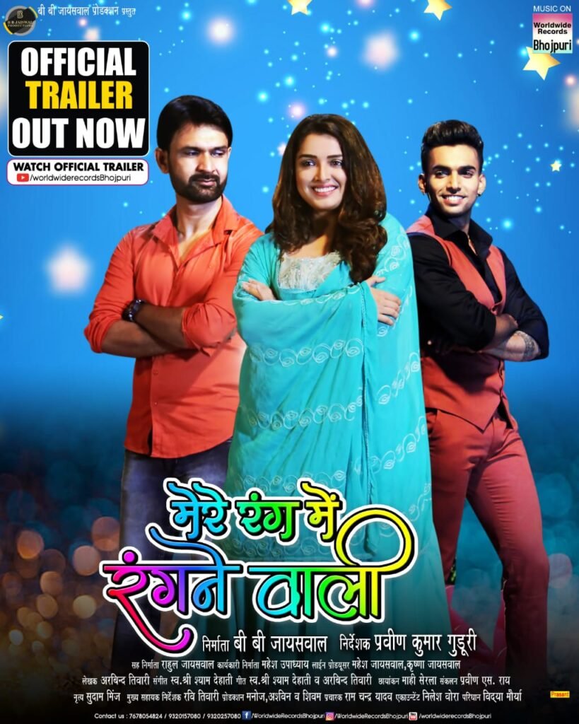 निर्माता बी बी जायसवाल की इस फिल्म में जय यादव और आम्रपाली दूबे के अलावा प्रमुख भूमिका में मुकेश जायसवाल व राज प्रेमी हैं। क्या शानदार ट्रेलर है जितनी तारीफ की जाए कम होगा। ट्रेलर में आम्रपाली दुबे, जय यादव और मुकेश जायसवाल के बीच की एक प्यारी सी लव स्टोरी को दिखा गया है। इसमें आम्रपाली दुबे टिकटॉक स्टार बनकर अपना नाम बनाना चाहती है और जय यादव उनसे प्यार करते हैं। इस बीच एंट्री होती है मुकेश की जो एक टिकटॉक स्टार हैं। अब आम्रपाली मुकेश के प्यार में पड़ जाती हैं। अब इसी प्यारभरी लव स्टोरी का नाम है मेरे रंग में रंगने वाली।