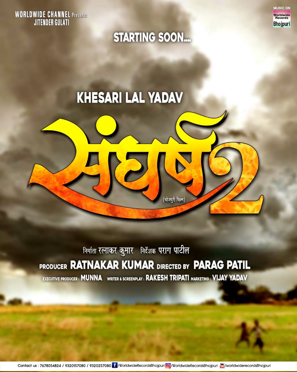 मुंबई| वर्ष 2018 में आई जितेंद्र गुलाटी और वर्ल्डवाइड रिकार्ड्स चैनल प्रस्तुत भोजपुरी फिल्म ‘संघर्ष’ की अपार सफलता के बाद अब जल्द ही निर्माता रत्नाकर कुमार ‘संघर्ष 2’ लेकर आ रहे हैं। अब सोचने वाली बात ये है कि क्या संघर्ष 2 की कहानी पहली कहानी को आगे बढ़ाएगी या संघर्ष 2 की कहानी कुछ हटके होगी। हालही में रत्नाकर कुमार द्वारा सोशल मीडिया साइट पर एक पोस्टर शेयर किया गया है। जोकि सोशल मीडिया में तेजी से वायरल हो रहा है। इस पोस्टर में कुछ ज्यादा तो रिवील नहीं किया गया है, लेकिन पोस्टर पर भोजपुरी सुपरस्टार खेसारी लाल यादव का नाम लिखा हुआ है, तो ये कहना गलत नहीं होगा कि फिल्म में एक बार फिर से खेसारी अपना संघर्ष दोहराएंगे। इस बार भी संघर्ष 2 की बागडोर निर्देशक पराग पाटिल के हाथों में हैं। फिल्म के कार्यकारी निर्देशक हैं मुन्ना। फिल्म का लेखन और स्क्रीनप्ले राकेश त्रिपाठी का है और मार्केटिंग विजय यादव संभाल रहे है। फिल्म के प्रचार प्रसार की जिम्मेदारी रामचन्द्र यादव और ब्रजेश मेहर के पास है।