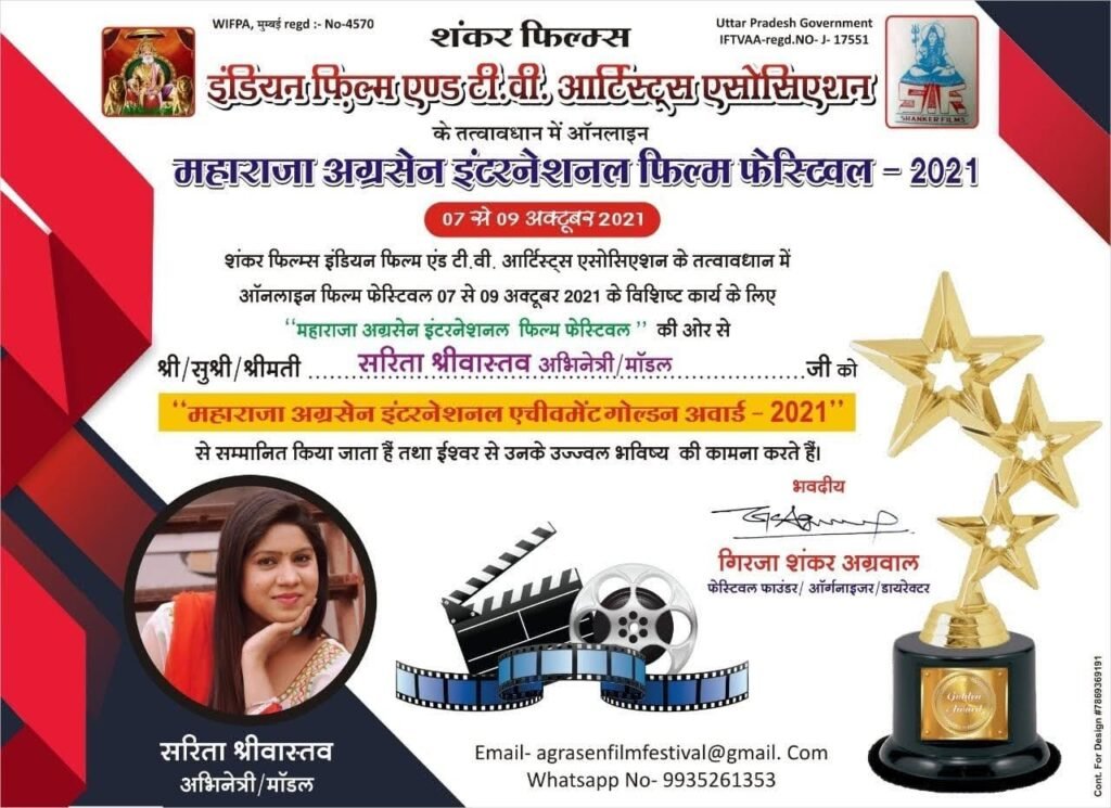 काशी की रहने वाली मॉडल/एक्ट्रेस सरिता श्रीवास्तव को महाराजा अग्रसेन लाईफ टाइम अचीवमेंट गोल्डन अवॉर्ड का मिला सम्मान। 7-9 अक्टूबर तक महाराजा अग्रसेन इंटरनेशनल फिल्म फेस्टिवल का ऑनलाइन दूसरा आयोजन कराया गया। साथ ही फिल्म फेस्टि