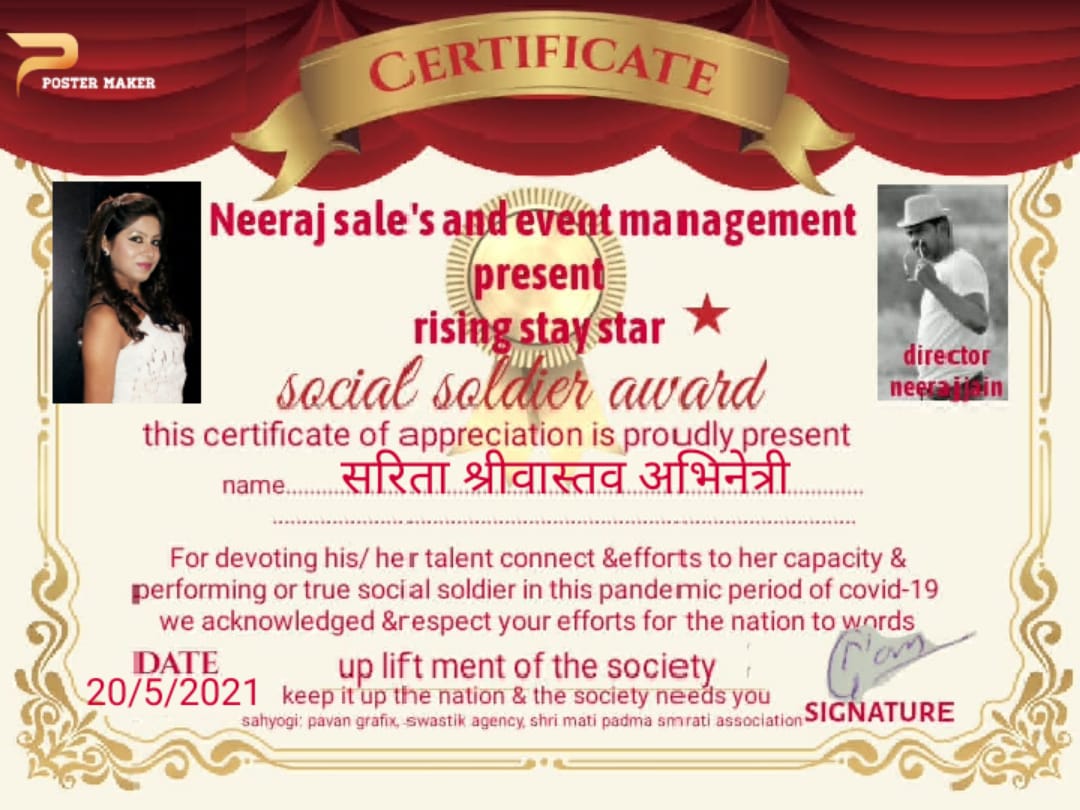 काशी, उत्तर प्रदेश की रहने वाली मॉडल/ एक्ट्रेस सरिता श्रीवास्तव जी को उनके अच्छे काम और समस्या के समय पर ज़रूरत मंदो की मदद के करने के लिए और उनके इस निस्वार्थ भाव से सेवा करने की इच्छा रखने के कारण।