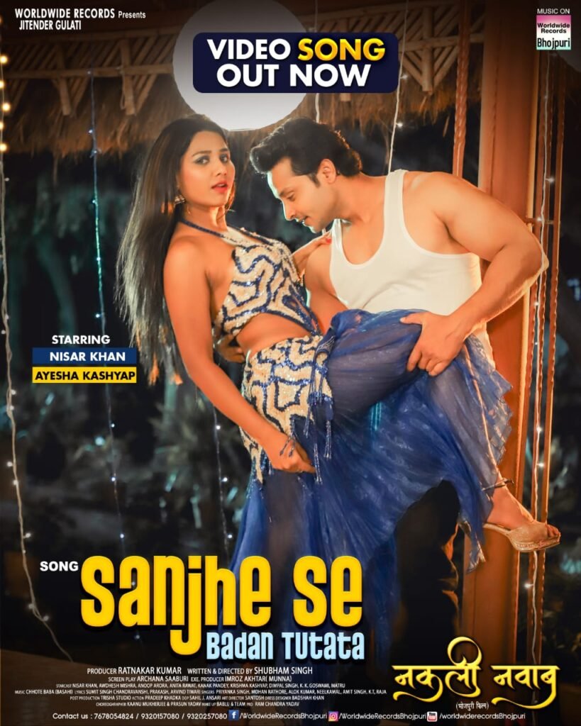 मुंबई| वर्ल्डवाइड चैनल और जितेंद्र गुलाटी प्रस्तुत बहुप्रतीक्षित भोजपुरी फिल्म “नकली नवाब” का धमाकेदार वीडियो सांग “सांझे से बदन टूटा ता” वर्ल्डवाइड रिकॉर्ड्स भोजपुरी के ऑफिसियल यूट्यूब चैनल पर रिलीज होते ही पॉपुलर हो गया है। इस गाने में निसार खान और आयेशा कश्यप अप्सरा ने खूब धमाल मचाया है।