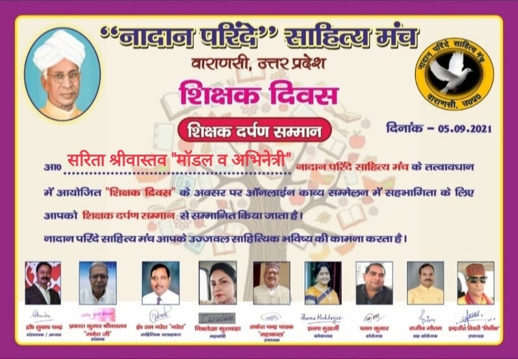 “नादान परिंदे” साहित्य मंच वाराणसी उत्तर- प्रदेश का आठवां ऑनलाइन शिक्षक दिवस पर “काव्य गोष्ठी” 5 सितम्बर 2021 को आयोजन किया गया। बहुत ही हर्षोल्लास के साथ “काव्य गोष्ठी” का आयोजन संप्पन हुआ। इस “काव्य गोष्ठी” में “काशी” की रहने वाली मॉडल “सरिता श्रीवास्तव” को “शिक्षक दर्पण सम्मान” देके सम्मानित किया गया।