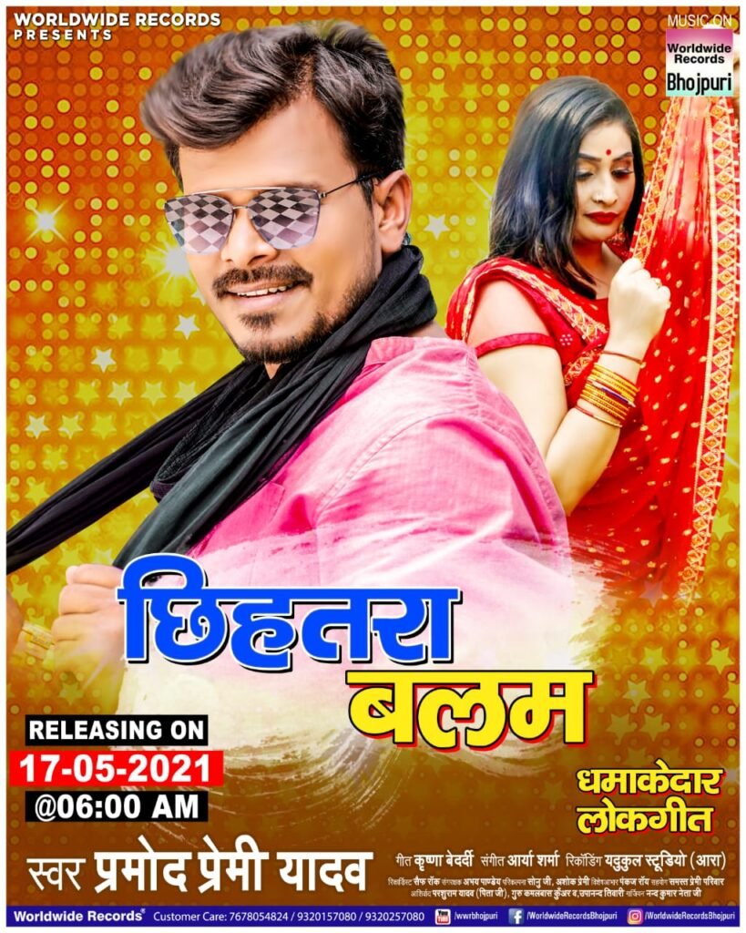 मुंबई| भोजपुरी सिनेमा के यूथस्टार प्रमोद प्रेमी यादव का धमाकेदार नया गीत “छिहतरा बलम” कल 17 मई को सुबह 6 बजे रिलीज़ होने जा रहा है। वर्ल्डवाइड रिकॉर्ड्स भोजपुरी के ऑफिसियल यूट्यूब चैनल पर प्रमोद प्रेमी यादव का यह गाना आउट किया जाएगा। रिलीज होने जा रहे इस गाने का पोस्टर और टीजर सोशल मीडिया में जारी किया गया है। जिसे श्रोताओं दर्शकों द्वारा खूब पसंद किया जा रहा है।