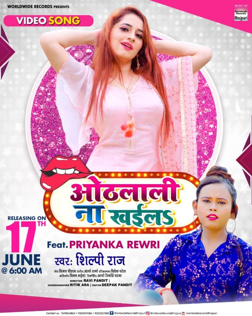 वर्ल्डवाइड रिकार्ड्स से अनुबंध होने के बाद अभिनेत्री प्रियंका रेवड़ी का पहला धमाकेदार म्यूजिक वीडियो सांग “ओठलाली ना खईलs” आज रिलीज किया गया है। जिसे अपनी मधुर आवाज में गाया है ट्रेंडिंग सिंगर शिल्पी राज ने। प्रियंका रेवड़ी की मनमोहक अदा और शिल्पी राज का मधुर आवाज में यह गाना काफी वायरल हो रहा है। यह सांग भव्य पैमाने पर फिल्माया गया है। सांग में दर्शकों को प्रियंका का एक अलग ही रूप देखने को मिल रहा है जैसा पहले किसी ने देखा नहीं होगा। “ओठलाली ना खईलs” को वर्ल्डवाइड रिकॉर्ड्स भोजपुरी के ऑफिसियल यूट्यूब चैनल पर रिलीज किया गया है, जिसे कुछ ही घन्टे में काफी व्यूज मिल गए हैं।