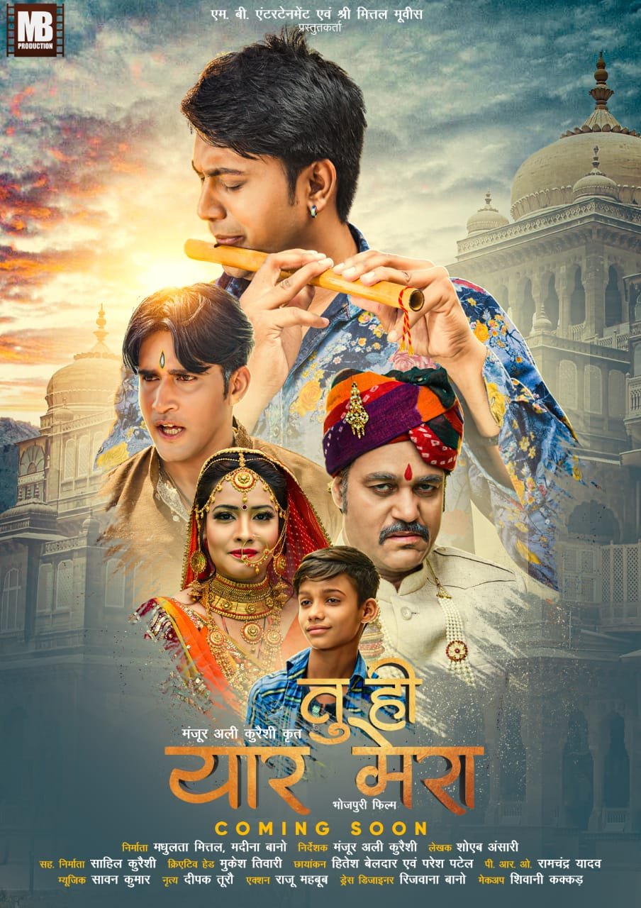 गौरतलब है कि फ़िल्म “तू ही यार मेरा” का फर्स्ट लुक काफी यूनिक और कलरफ़ुल है। फ़िल्म के हीरो राहुल सिंह इसमें बांसुरी बजाते नजर आ रहे हैं। वहीं हीरोइन रेशमा शेख बहुत सारे आभूषण पहने दुल्हन के लुक में दिख रही हैं। पोस्टर में अयाज़ खान एक अलग लुक में दिख रहे हैं। फ़िल्म में एक बच्चे की भी महत्वपूर्ण भूमिका प्रतीत हो रही है क्योंकि फर्स्ट लुक में चाइल्ड आर्टिस्ट की एक झलक भी नजर आ रही है। पोस्टर के बैकग्राउंड में भव्य महल और मंदिर भी दिखाई दे रहे हैं। चूंकि पूरी फिल्म की शूटिंग भव्य पैमाने पर राजस्थान में की गई है इसलिए वहां की भव्य लोकेशन्स भी फ़िल्म में देखने को मिलेगी। आपको बता दें कि राहुल रेशमा की रोमांटिक जोड़ी सुपरहिट फ़िल्म प्लेटफॉर्म नं. 2 से हिट चली आ रही है। ऐसे में इस फ़िल्म को लेकर सभी लोग काफी उत्साहित हैं। फ़िल्म से सबको ढेर सारी उम्मीद हैं कि रिलीज के साथ ही यह फ़िल्म दर्शकों द्वारा काफी पसंद की जाएगी।
