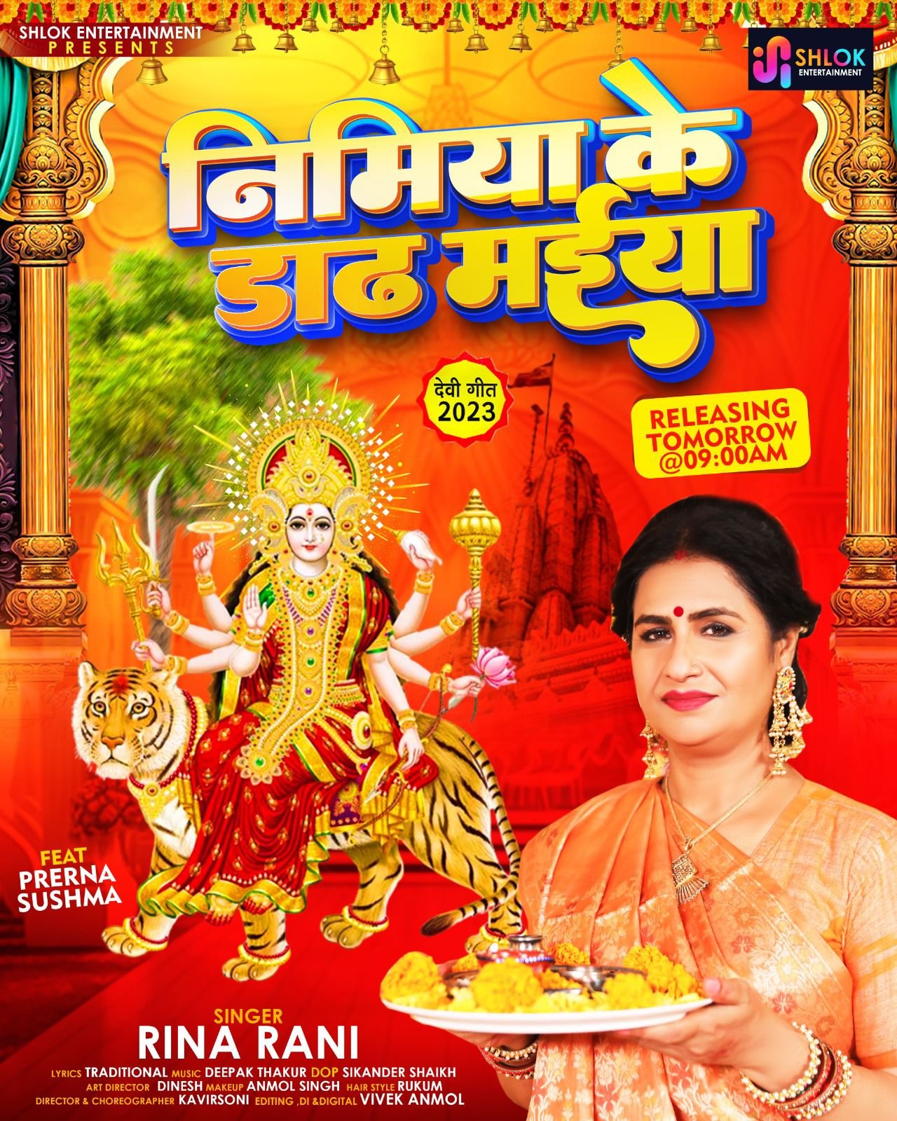 उन्होंने अपने आवाज में इस पाम्परिक लोक भजन को गाया है और इसका वीडियो फ़ीट भी आज रिलीज़ किया गया है । रीना रानी इसके पहले बहुत सारे टीवी सीरियल और भोजपुरी फिल्मों में बतौर अभिनेत्री बड़े बड़े काम कर चुकी हैं और इनका नाम टीवी और भोजपुरी फ़िल्म इंडस्ट्री में बड़े अदब से लिया जाता है । अब उन्होंने आज शारदीय नवरात्रि के प्रथम दिवस पर अपने इस ट्रेडिशनल लोक भजन को लेकर आने का निर्णय लिया है । इस पारम्परिक गीत को संगीत दिया है दीपक ठाकुर ने , जबकि इस वीडियो के कोरोयोग्राफर व निर्देशक हैं कवीर सोनी, डीओपी हैं सिकन्दर शेख,गीत की एडिटिंग विवेक अनमोल ने किया है । इस गाने के वीडियो फीट में प्रेरणा सुषमा दिखाई दे रही हैं । यह पारम्परिक लोक भजन श्लोक एंटरटेनमेंट के यूट्यूब चैनल पर रिलीज किया गया है ।