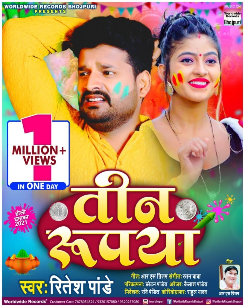 मुंबई : भोजपुरी सुपरस्टार रितेश पांडे इन दिनों यूट्यूब पर छाए हुए हैं। इसी बीच रितेश पांडे का फुल टू धमाल होली सांग तीन रुपया ने एक दिन में 1 मिलियन व्यूज पार कर लिए हैं। और यह गाना यूट्यूब पर तेजी से वायरल हो रहा है। हाल ही वर्ल्डवाइड रिकार्ड्स भोजपुरी से रिलीज हुआ रितेश पांडेय का होली सॉन्ग सोशल मीडिया पर छाया हुआ है। गाने के बोल हैं ‘तीन रुपया’।