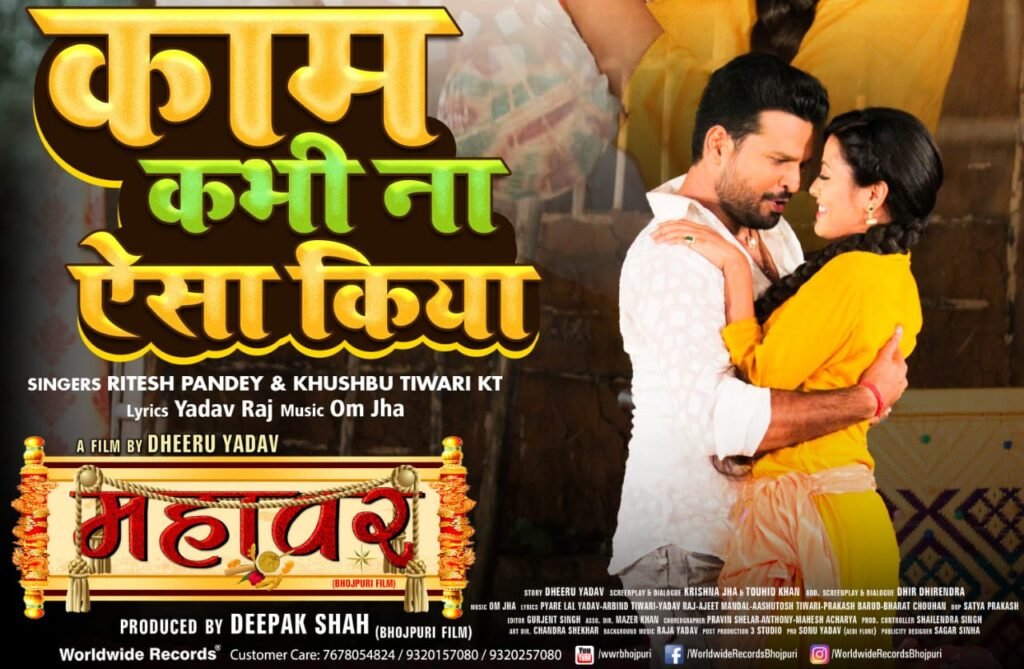 भोजपुरी के सुपरस्टार रितेश पांडे और ऋचा दिक्षित की लाजवाब अभिनय से सजी भोजपुरी फिल्म महावर का गाना “काम कभी ना ऐसा किया” वर्ल्डवाइड रिकॉर्ड्स भोजपुरी के ऑफिशियल यूट्यूब चैनल से रिलीज किया गया है। इस गाने के वीडियो में दिखाया गया है कि रितेश पांडे अपनी प्रेमिका ऋचा दिक्षित से किस देने की डिमांड कर रहे हैं जिसके उत्तर में ऋचा दिक्षित कहती हैं छी छी काम कभी ना ऐसा किया। रोमांटिक मिजाज में छेड़छाड़ वाले इस वीडियो सांग में रितेश पांडे देसी लुक में नजर आ रहे हैं, वहीं सूट सलवार ड्रेस में ऋचा दिक्षित कयामत ढा रही हैं। गाने का पिक्चराइजेशन रिच लोकेशन पर किया गया है। इस गाने को गाया है रितेश पांडे और खुशबू तिवारी केटी ने। इस गीत को लिखा है यादव राज ने, जिसे मधुर संगीत से सजाया है संगीतकार ओम झा ने।