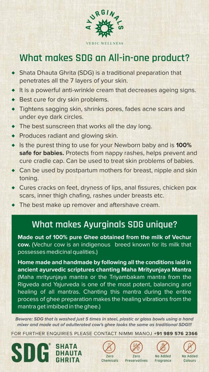 Shata Dhauta Gritha is a natural, additives-free, all-in-one skin care product. Ayurginals SDG is made out of 100% pure Ghee obtained from the milk of Vechur cow. (Vechur cow is an indigenous breed known for its milk that possesses medicinal qualities.) Home made and handmade by following all the conditions laid in ancient ayunredic scriptures chanting Maha Mrityunjaya Mantra (Maha mrityunjaya mantra or the Triyambakam mantra from the Rigveda and Yajurveda is one of the most potent, balancing and healing of all mantras. Chanting this mantra during the entire process of ghee preparation makes the healing vibrations from the mantra get imbibed in the ghee.)