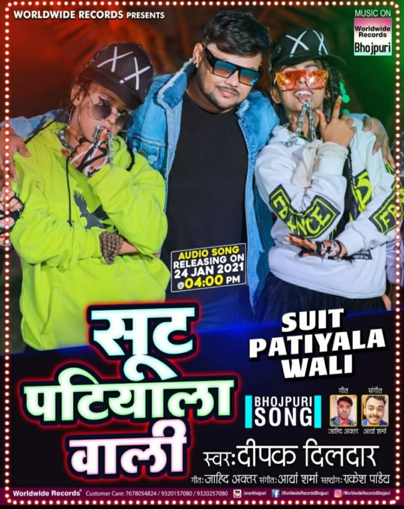 मुंबई| भोजपुरी फिल्म इंडस्ट्री के लोकप्रिय गायक और अभिनेता दीपक दिलदार का नया सुपर हिट सांग “सूट पटियाला वाली” वर्ल्डवाइड रिकॉर्ड्स भोजपुरी के ऑफिसियल यूट्यूब चैनल से रिलीज़ किया गया है जिसे बेहद शानदार रिस्पॉन्स मिल रहा है। इस खूबसूरत सांग के लीरिक्स लिखे हैं जाहिद अख्तर ने जबकि इसका बेहतरीन संगीत तैयार किया है आर्या शर्मा ने। दीपक दिलदार के इस मस्ती भरे सांग में राकेश पांडेय का सहयोग प्राप्त है। फिलहाल इस गाने का केवल ऑडियो ही आउट किया गया है जल्द ही इसका वीडियो भी रिलीज़ किया जाएगा।