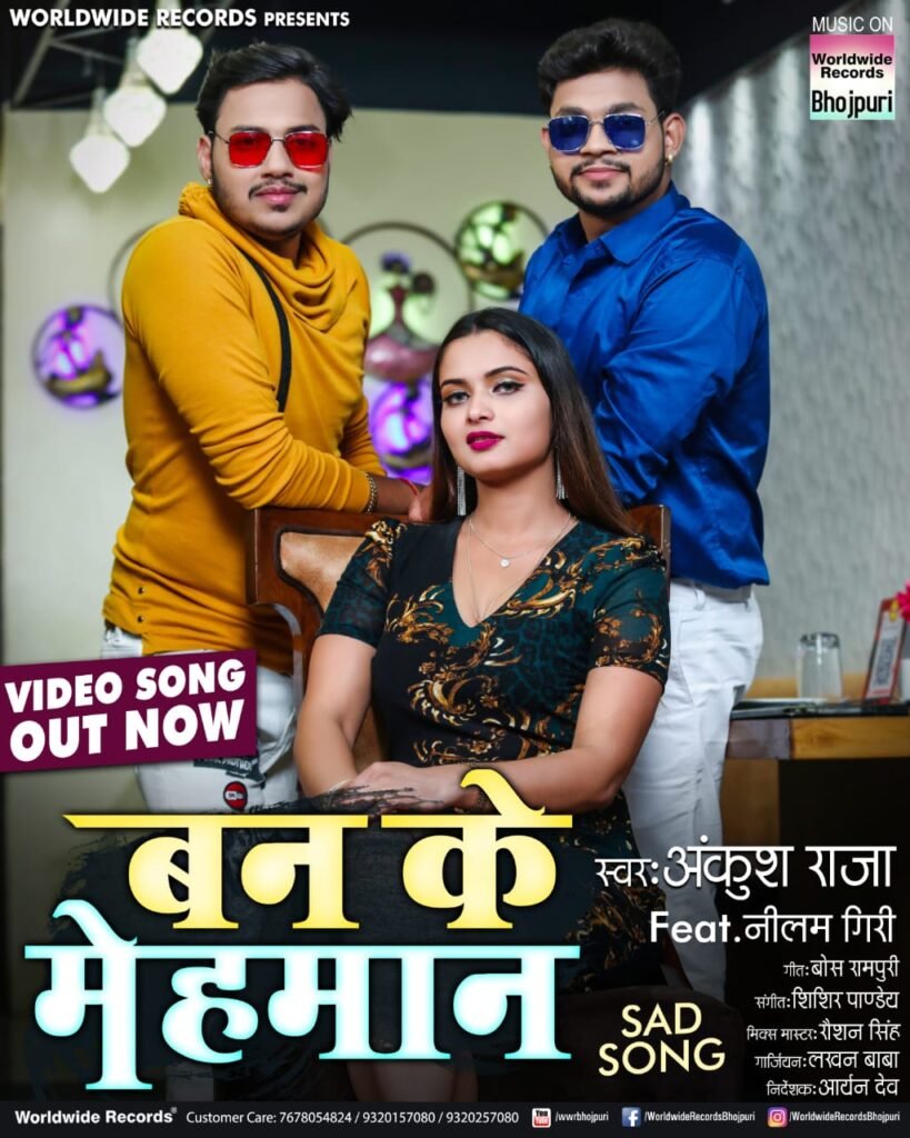 मुंबई| सुपरहिट सिंगर अंकुश राजा और भोजपुरी की नई सेंशेसन नीलम गिरी का बहुप्रतीक्षित वीडियो सांग बनके मेहमान यूट्यूब पर वर्ल्डवाइड रिकॉर्ड्स भोजपुरी के ऑफिसियल चैनल से रिलीज किया है। इस गाने में सिंगर एक्टर अंकुश राजा ने शानदार आवाज़ में गाया है। यह सैड सांग काफी पसंद किया जा रहा है। गाने के वीडियो में अंकुश राजा और भोजपुरी की नई सेंशेसन नीलम गिरि का गजब का परफॉर्मेंस दिख रहा है। वर्ल्डवाइड रिकॉर्ड्स भोजपुरी का यह नया धमाका सांग काफी पसंद किया जा रहा है। इस गाने में मॉडर्न ड्रेस में अंकुश राजा और स्टाइलिश ड्रेस में नीलम गिरी धमाल मचाते व ठुमके लगाते हुए नजर आ रहे हैं। इस गाने में नीलम ने कमाल परफॉर्मेंस करके अपनी अदा का खूब जलवा बिखेरा है। गीतकार बोस रामपुरी के लिखे इस गीत को मधुर संगीत से सजाया है शिशिर पांडेय ने। मिक्स मास्टरिंग रौशन सिंह ने किया है। वीडियो डायरेक्टर आर्यन देव है। डीओपी विजय, नितेश, एडीटर शुभम बाबू हैं।