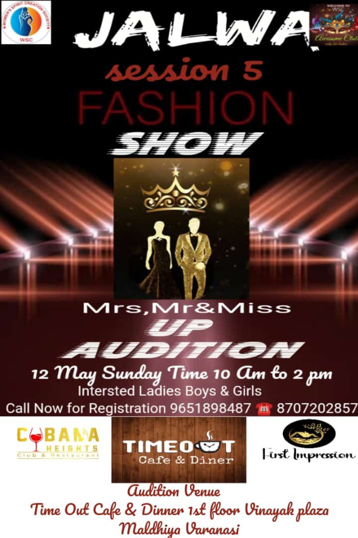 और उनके प्रतिभा को निखरते हुए आत्मनिर्भर बनने के लिए प्रोत्साहित करती रहती है उन्होंने बताया कि प्रतिवर्ष की तरह इस वर्ष भी wsc जलवा की तरफ से फैशन शो कराया जा रहा है जिसका प्रथम स्टेप ऑडिशन 12 मई को मलदहिया स्थित विनायक प्लाजा प्रथम तल *टाइम आउट कैफे एंड डिनर में 10 से 2 बजे तक ऑडिशन लिया जाएगा जिसमें 15 वर्ष से लेकर 50 + इच्छुक महिलाएं ,युवक युवती भागीदारी ले सकेंगे ये शो उत्तरप्रदेश लेबल का कराया जायेगा तो किसी भी सिटी से सभी प्रतिभागी लड़के लड़किया फैशन शो में आकर अपना नाम रोशन कर कई टाइटल अवार्ड साथ ही मिसेज मिस्टर और मिस यू पी का खिताब जीत सकते है|